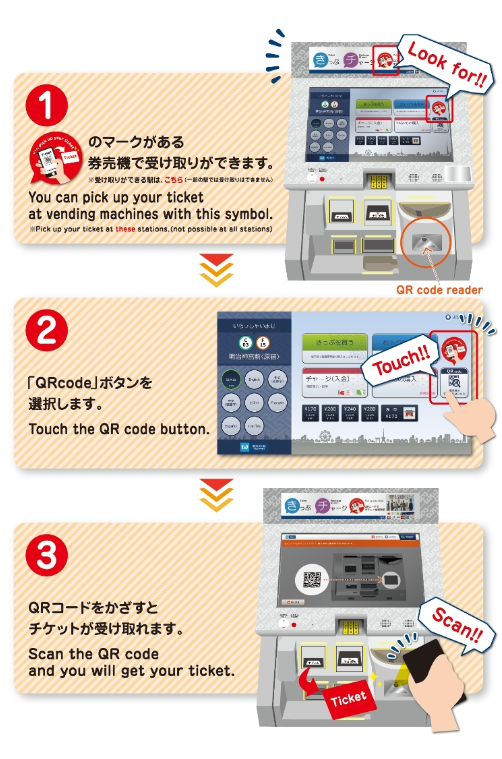 내가 다닌 역에는 수많은 티켓 발매기 중 저 빨간 마크가 붙어 있는 기계가 꼭 1개는 있었다(기계가 살짝 다르게 생김, 더 크다고 해야 하나...). 저 마크만 찾으면 어렵지 않다. 바코드 모양 터치하고 바코드를 가져다 대면 발매 된다. 1장 이상 구매했다면 기다리자. 알아서 구매수에 맞게 나온다.